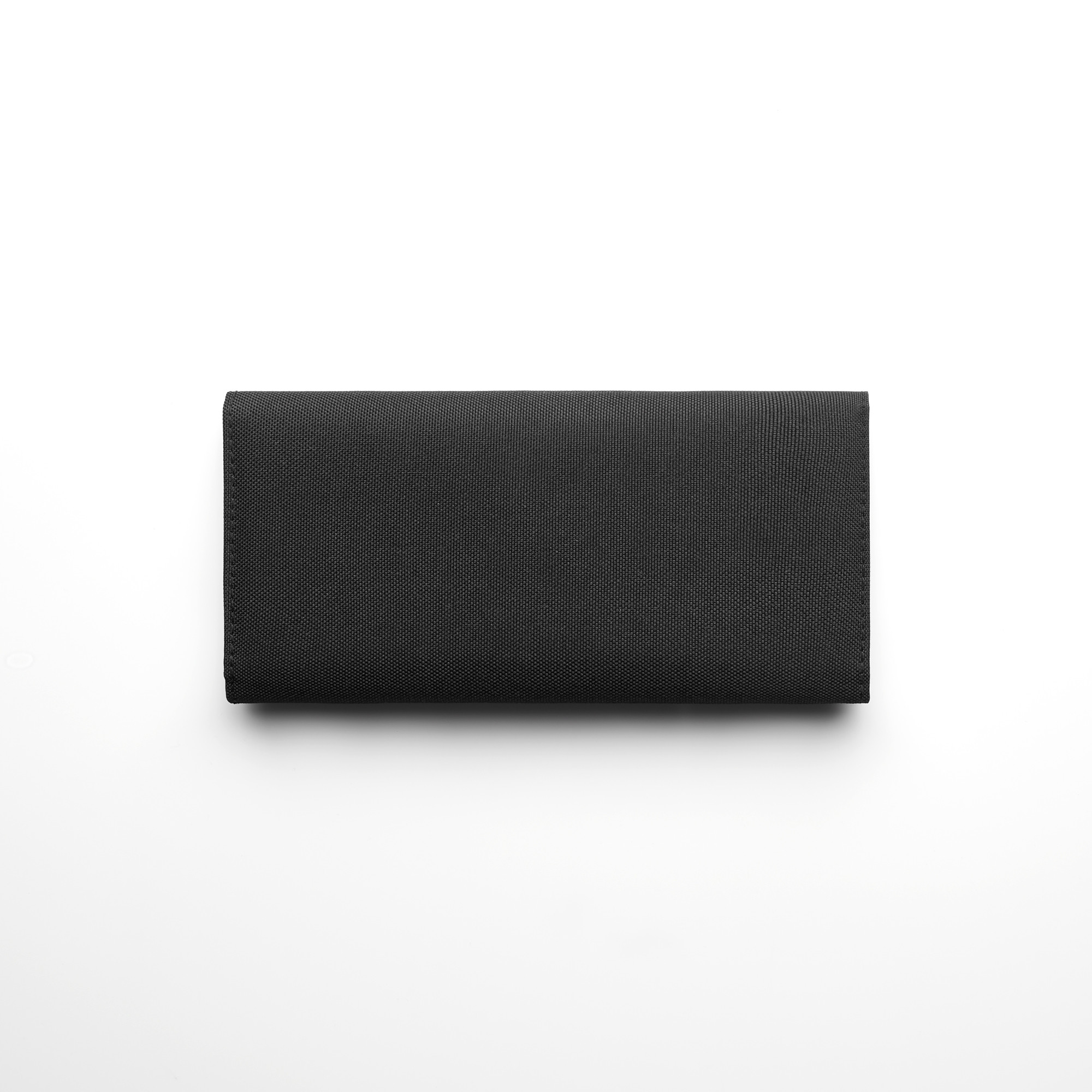 Long internal note & card compartments, mesh window card sleeves, double snap closure